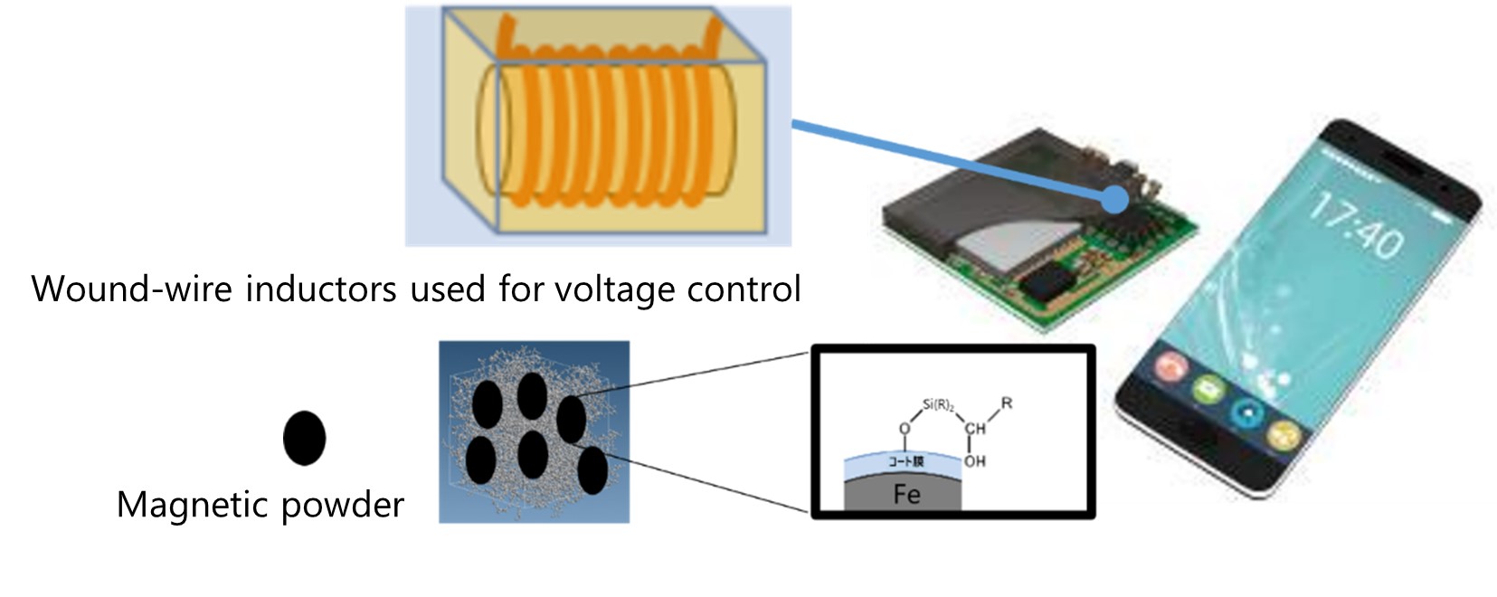 Wound inductors, commonly used in power circuits, are formed by molding wound wire with a magnetic molding compound composed of resin and magnetic powder. However, insufficient bonding strength at the resin–magnetic powder interface can cause the material to break under external force after mounting, leading to reliability issues. Therefore, improving the bonding strength between resin and magnetic powder has been a key challenge.