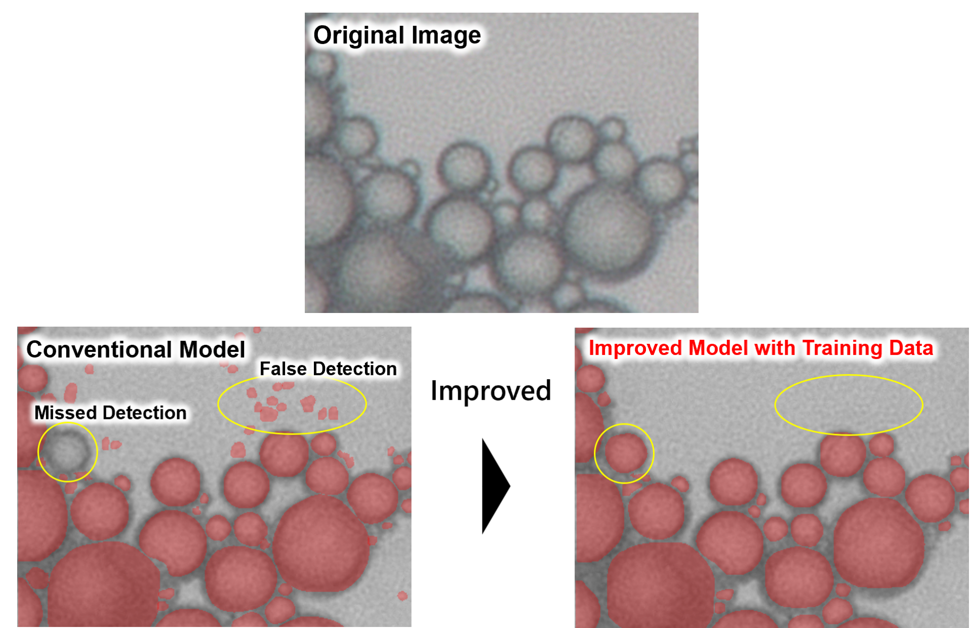 Automating inspections using deep learning requires training data that reflects the judgment of experienced inspectors. This data must be created with pixel-level precision, as even minor errors can significantly degrade analysis accuracy. The process involves manually color-coding each particle in the image, demanding high concentration and accuracy, and has been difficult to scale due to labor shortages.